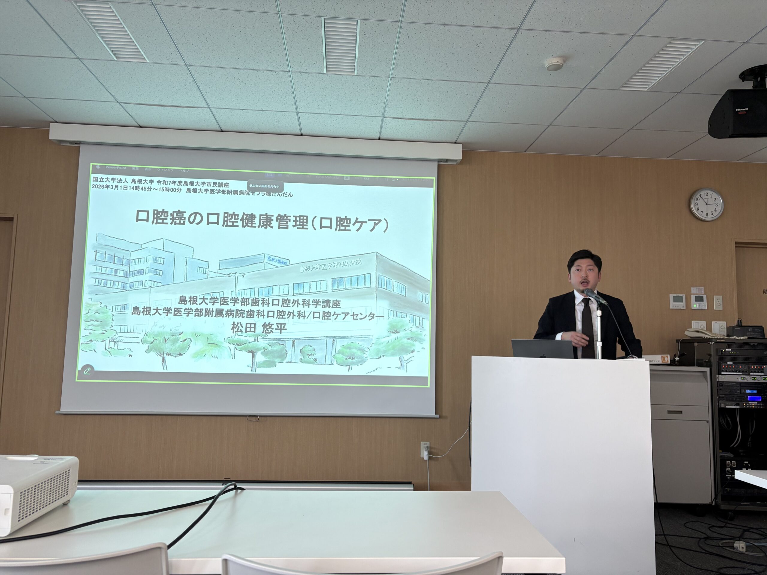 2026年3月1日に国立大学法人島根大学の公開講座「やさしく学ぶ 最新!!お口のがん:口腔癌 の治療 〜標準治療から最新の光免疫治療の解説まで〜」を開催しました。ウェブ上も含めて大変多くの方々にご参加いただきました。私は口腔がん治療における口腔ケアについて講演させていただきました。まだまだ、「周術期等口腔機能管理」自体は医療者には普及しているものの、市民の皆様への普及がさらに必要と考えます。今後も、地域貢献活動に邁進し、最新の知識を誰もが手に入れられるように貢献していきたいと思います。