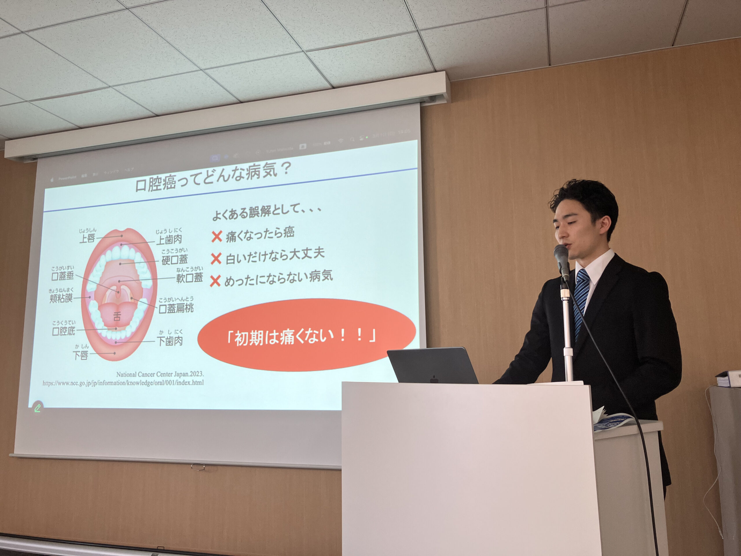 この度、2026年3月1日に市民公開講座「やさしく学ぶ 最新!!お口のがん:口腔癌 の治療 〜標準治療から最新の光免疫治療の解説まで〜」において、「基礎知識1 早期発見と診断について」と題して講演する機会をいただきました。一般市民の方々を対象とすることもあり、難しい内容をいかにわかりやすく伝えるか、ということを念頭にお話しさせていただきました。スライドの準備を行ううえで、大変勉強になることが多くありました。今後も地域医療に貢献できるよう、努力してまいりたいと思います。