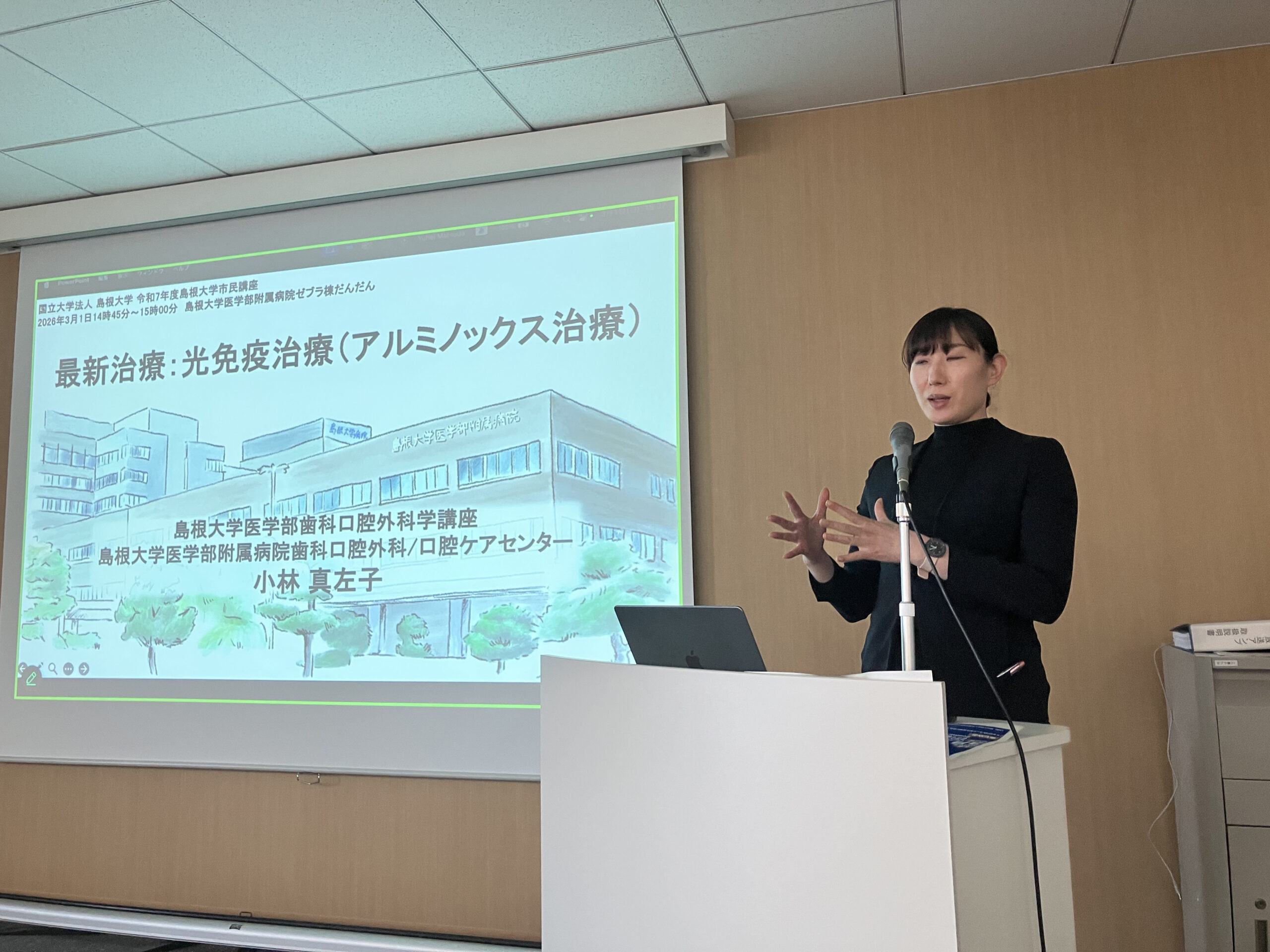 この度、2026年3月1日に島根大学医学部附属病院ゼブラ棟だんだんにて開催されました、「やさしく学ぶ 最新!!お口のがん:口腔癌 の治療 〜標準治療から最新の光免疫治療の解説まで〜」において講演を実施しました。私の担当はタイトルにもなっている光免疫治療(アルミノックス治療)についてでした。当院でも受けることができる最新の治療法であり、より多くの市民の方々にこの治療法について理解いただく機会が得られましたことに感謝申し上げます。貴重な機会をいただきました講座および大学関係者の皆様にこの場を借りてお礼申し上げます。