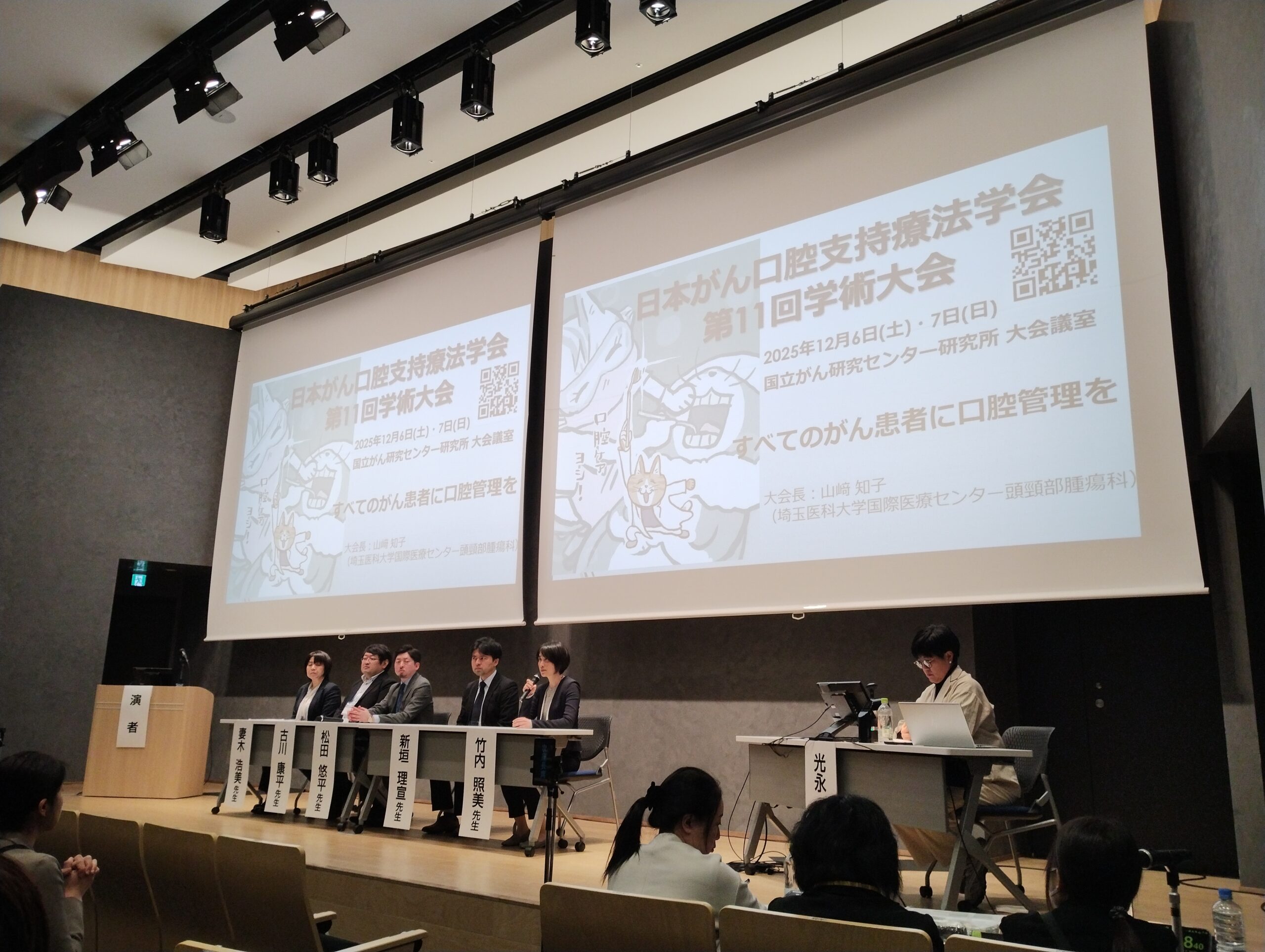 2025年12月6-7日に開催されました、日本がん口腔支持療法学会第11回学術大会において、シンポジウム2「薬剤関連顎骨壊死について」のシンポジストとして招聘いただきまして、「歯科衛生士の観点から考える薬剤関連顎骨壊死の予防と患者指導」のタイトルで講演いたしました。多職種が別々の観点から薬剤関連顎骨壊死について講演を行う形式であり、他の演者の方々の講演とディスカッションを行う中で多くの勉強をさせていただきました。