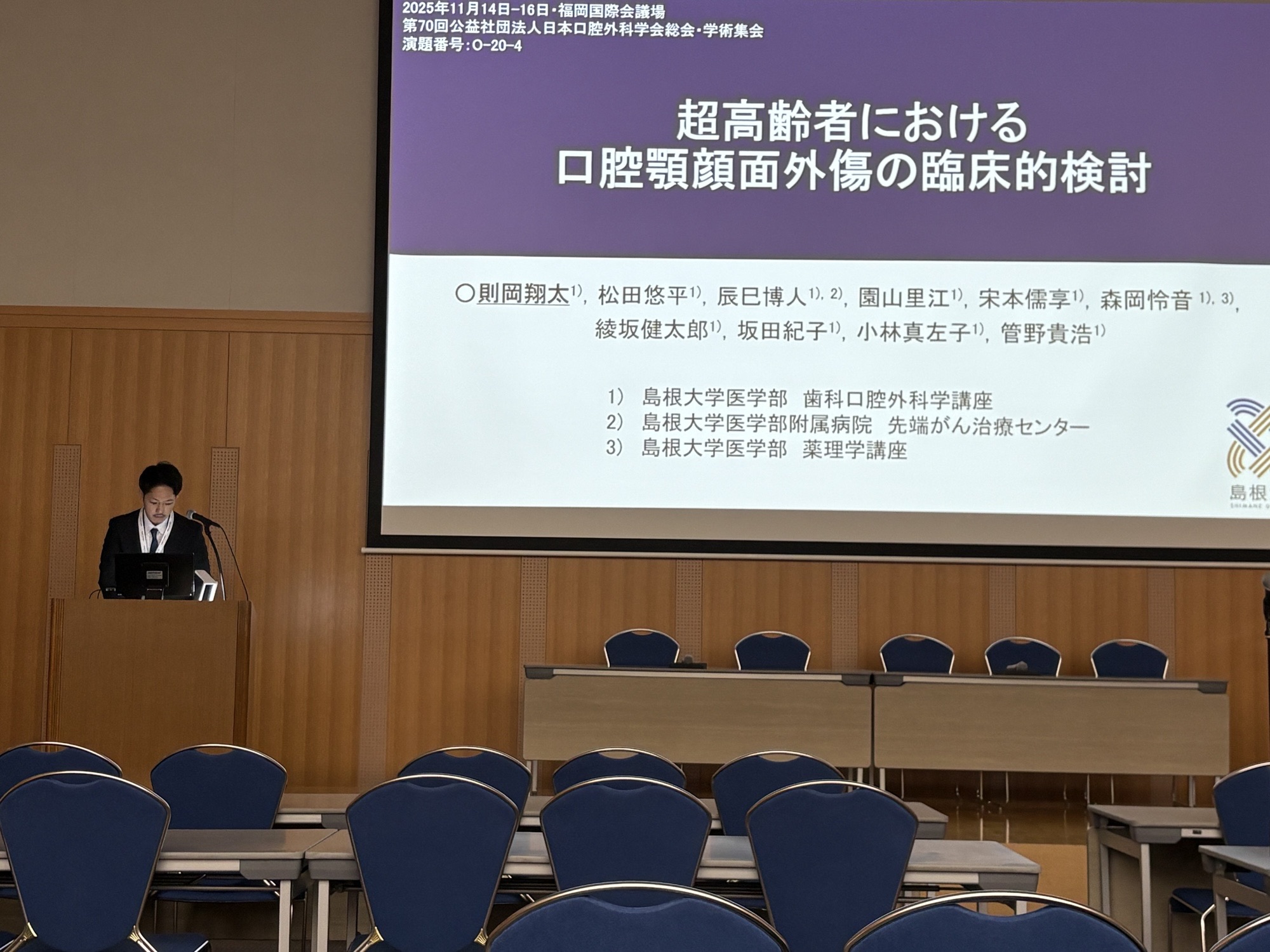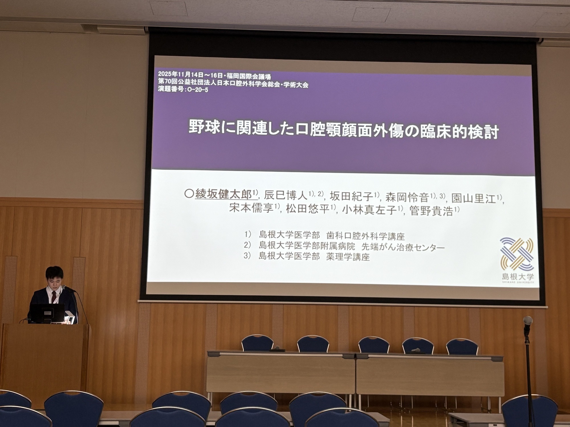 福岡県で開催されました第70回 (公社) 日本口腔外科学会総会・学術大会にて「野球に関連した口腔顎顔面外傷の臨床検討」について口演発表を行ってまいりました。発表を通じて学んだ統計手法を今後の研究活動に生かすとともに、発表した内容を論文にしたいと思います。学会会場では学生時代の友人や先輩に会うことができ、他施設の先生方とも交流することができ、有意義な時間を過ごすことができました。発表を行うにあたりましてご指導いただきました管野教授をはじめ、教員の先生方に深く御礼申し上げます。