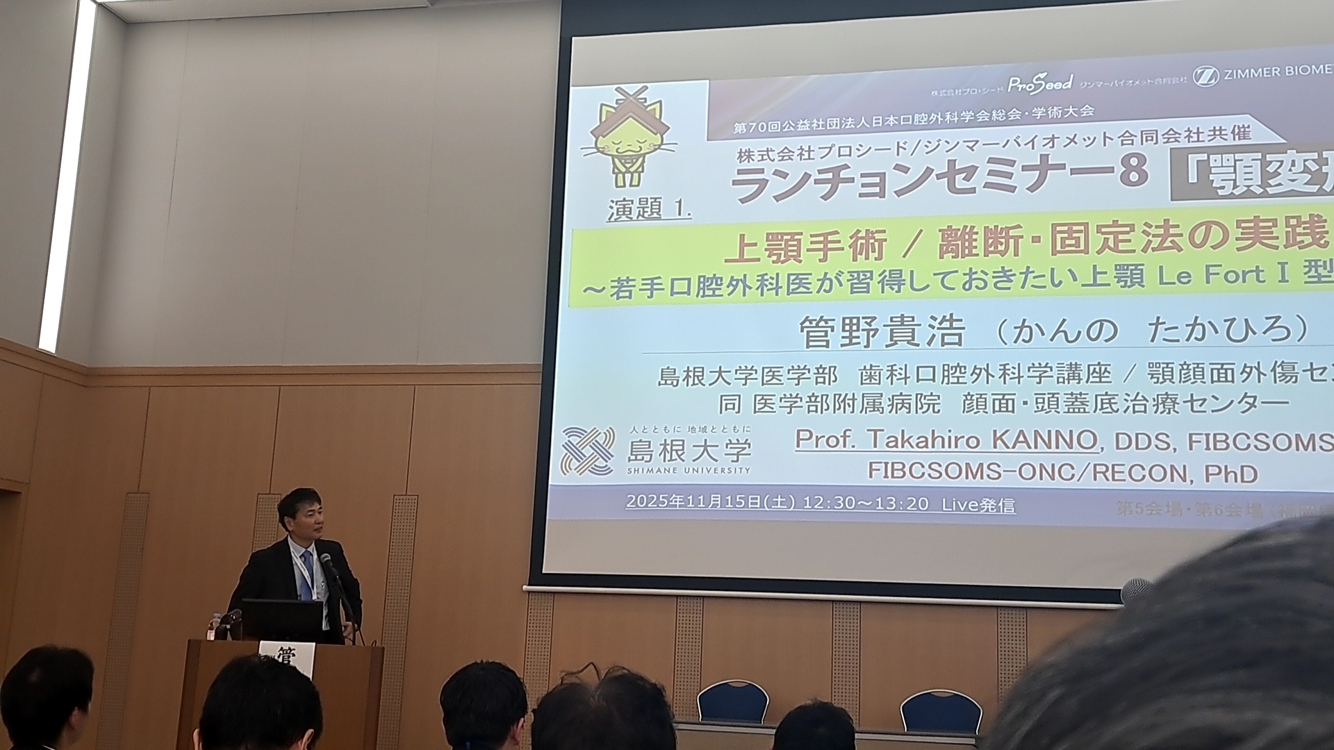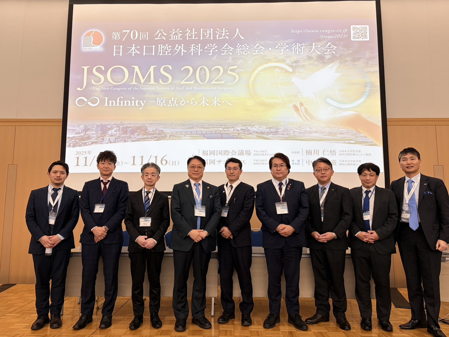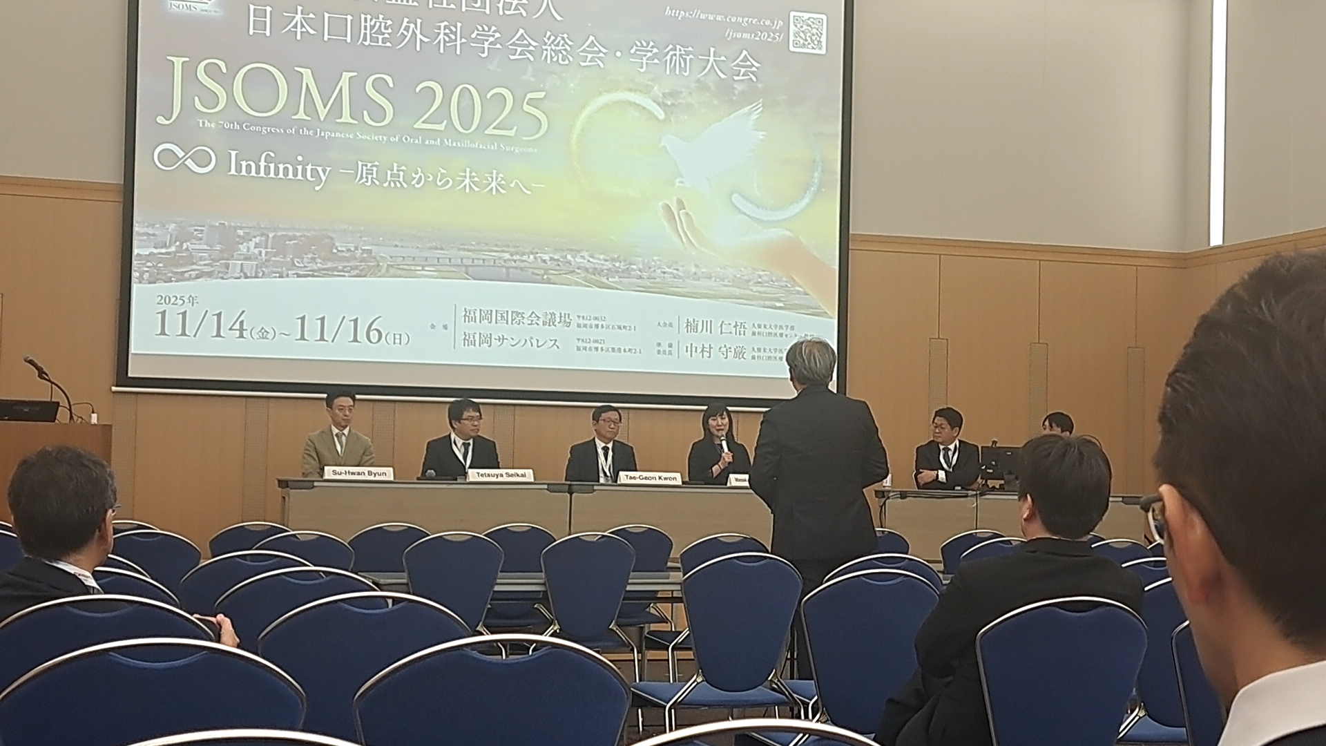 11月14日-16日にわたり、福岡国際会議場にて開催された上記総会学術大会に参加して参りました。公益社団法人日本口腔外科学会は、12,000人の歯科医師、医師の会員からなる学術集団でありますが、全国から6000名を超える参加者がありました。大変華やかに、学術の祭典として新規学術知見や、海外からの国際学術交流など大変多くを学ぶ有益な週末となりました。自らは、学術大会内の第40回日本病院歯科口腔外科協議会総会・学術集会でのシンポジウム『病院歯科口腔外科における中顔面骨骨折の治療連絡』での演者に召喚いただき、中顔面外傷治療におけるピットフォールと医科歯科連携治療の重要性~口腔外科医が習得しておきたい中顔面関連周囲合併損傷の診断と治療~として講演いたしました。またランチョンセミナー8 顎変形症にて上顎手術 / 離断・固定法の実践~若手口腔外科医が習得しておきたい上顎 Le FortⅠ型骨切り!~について講演をさせていただき、さらにスポンサードセミナー講演として上顎の解剖、Buttressおよび各種術式の紹介、上顎へのPlateの選択基準 と題して詳説させていただきました。講座からも多くの学術発表をおこない、いずれも大変有意義な建設的討議を行うことが出来ました。
