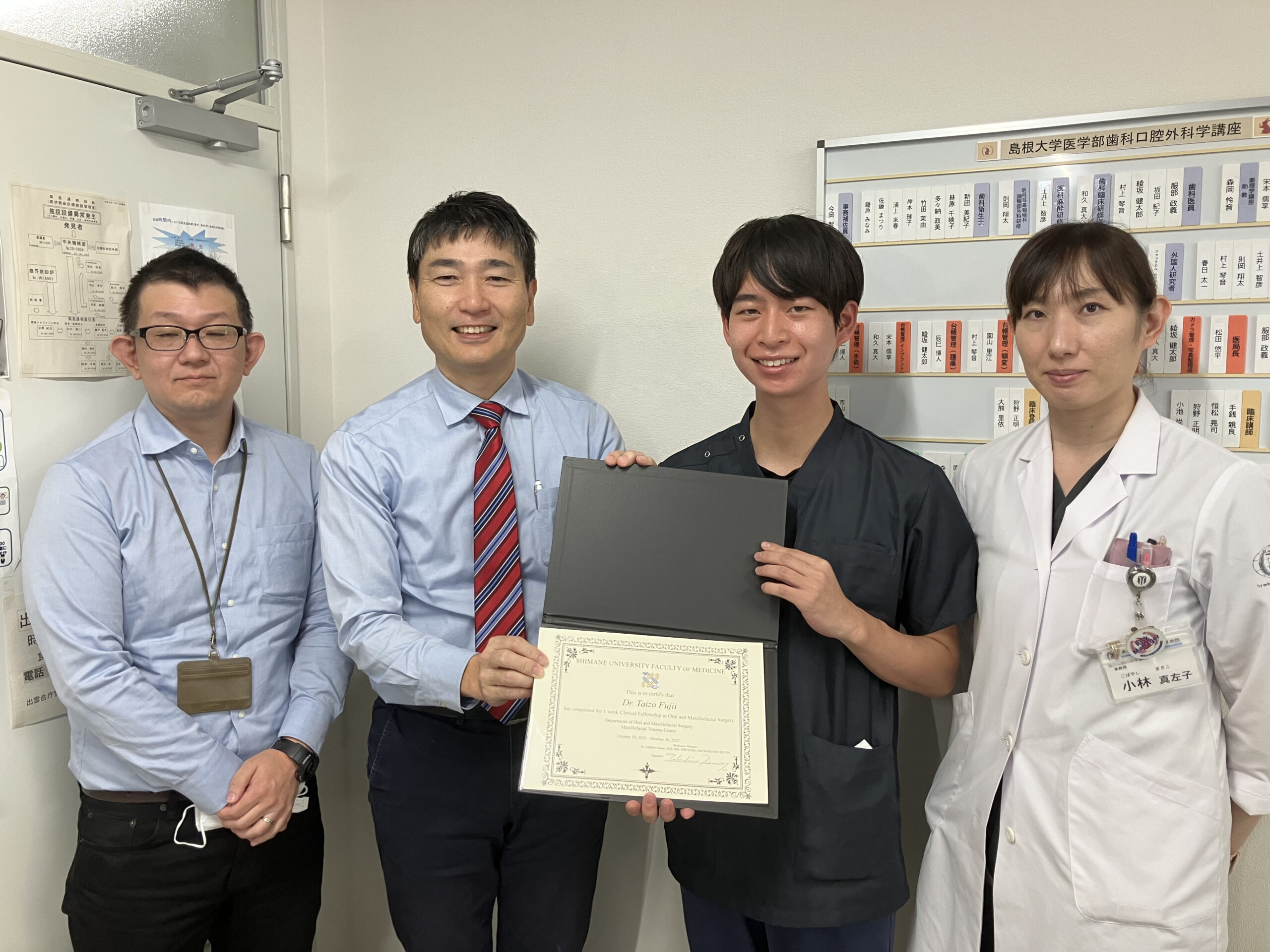 末筆ながら本研修の機会を賜りました日本口腔外科学会、九州歯科大学口腔内科学分野の吉岡教授、島根大学医学部歯科口腔外科学講座の医局員の皆様、そして管野教授に深謝申し上げます。頂戴しました経験をもとに、若手口腔外科医としてより一層、研鑽に努めて参る次第です。