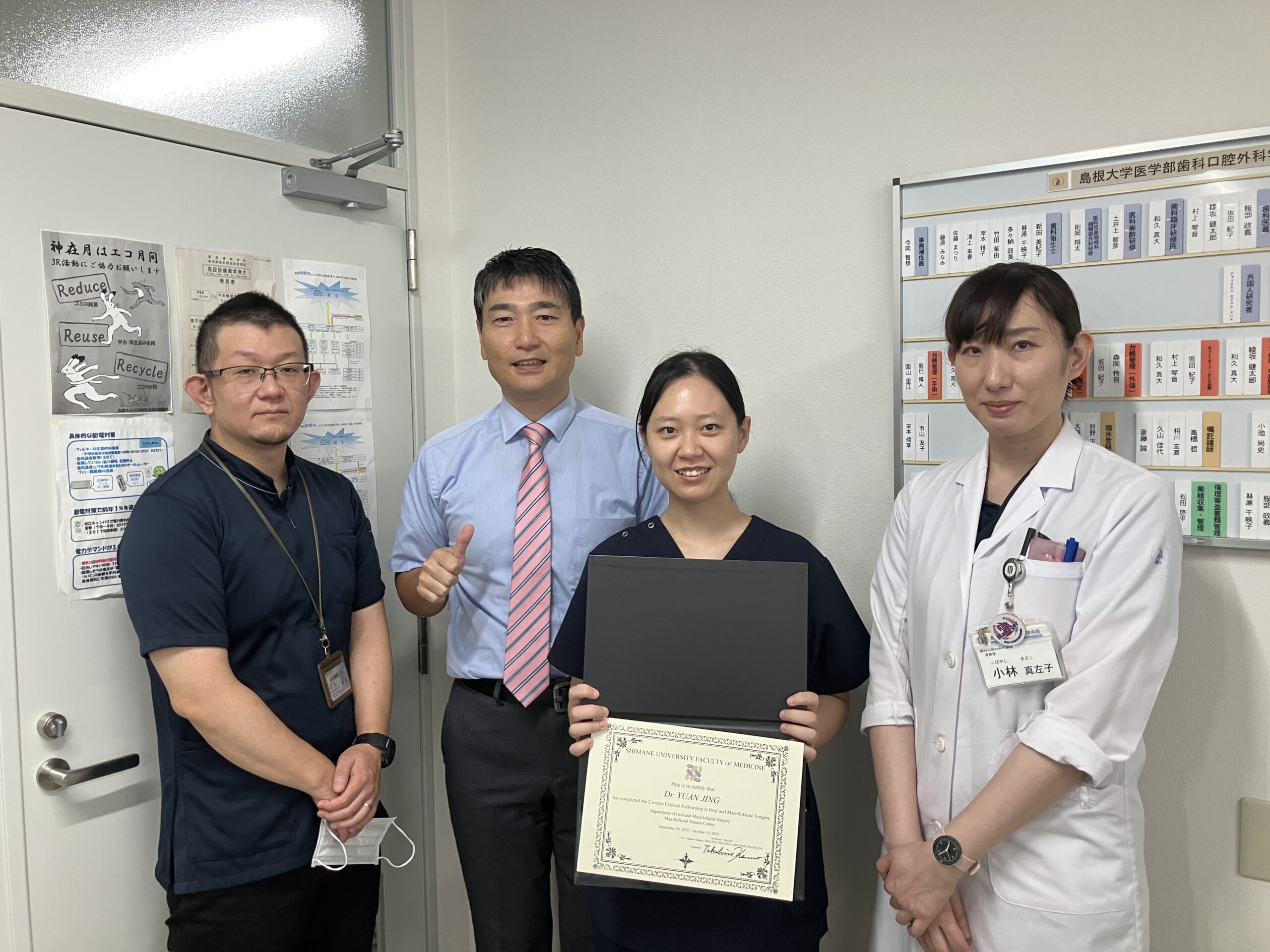 2025年9月29日から10月10日までの2週間にわたり、九州歯科大学 口腔内科学分野 (吉岡泉教授)/口腔顎顔面外科学分野(土生学教授)の教室より、袁 荊先生が日本口腔外科学会若手口腔外科医研修制度を利用されわれわれの診療科に研修に来られました。大変臨床および研究に熱心に取り組まれる若手女性口腔外科医であり、前傾姿勢で臨まれ将来が大変楽しみな先生でありました。わたくしの母校の後輩でもあり、今後も研鑽を積まれ着実にステップアップしてくださることを願います。2週間お疲れ様でした。