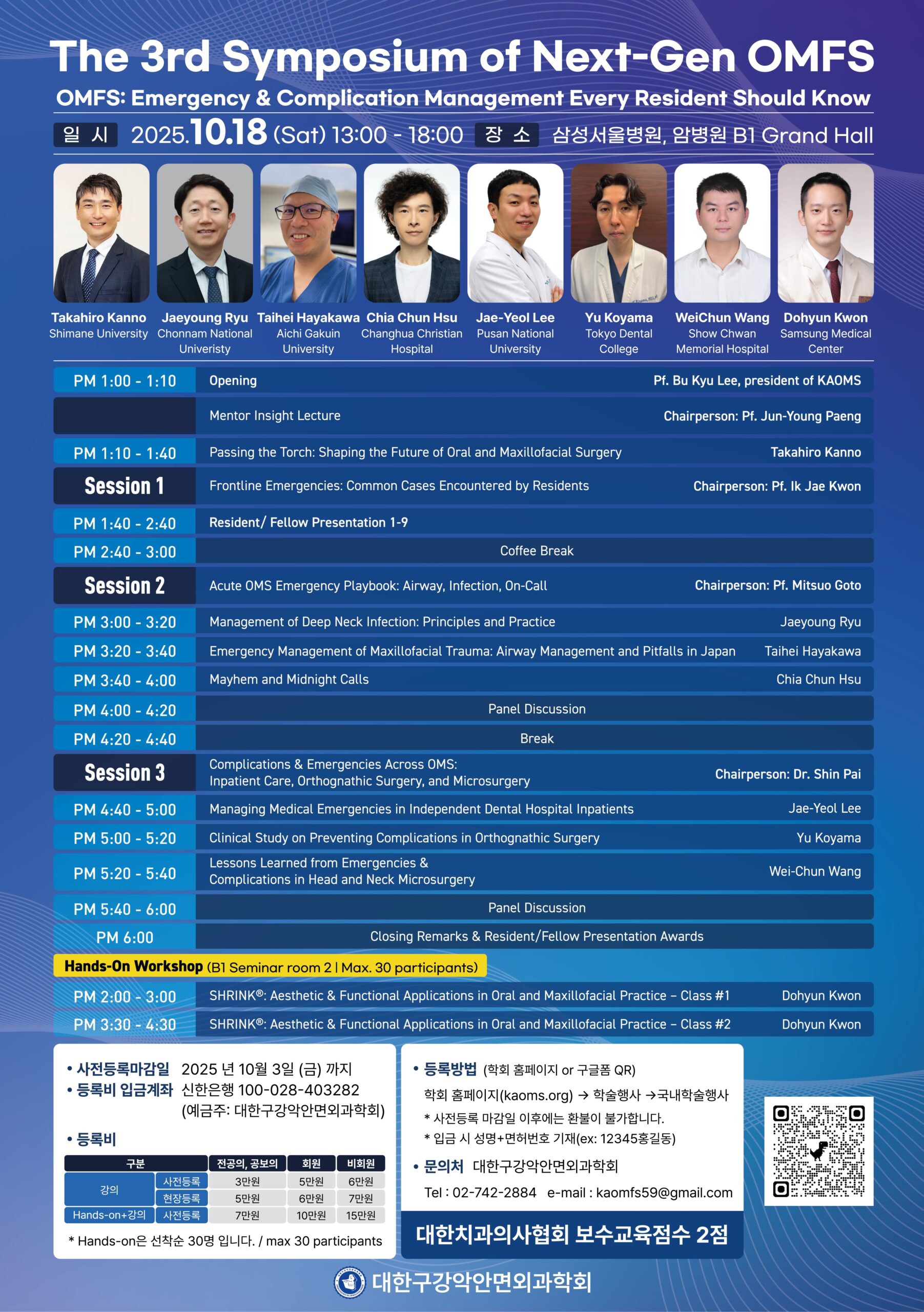 10月18日韓国、ソウルの中心に存在するSamsung Medical Center内の講堂にて開催された大韓口腔顎顔面外科学会第3回若手口腔外科医(The 3rd NextGen) シンポジウムに、教育講演演者に召喚いただきました。Passing the Torch: Shaping the Future of Oral and Maxillofacial Surgeryという講演タイトルにて、次世代の口腔外科医に口腔顎顔面外科の臨床や研究、そして口腔外科医としての路がいかに国民の顎口腔の健康と疾病治療に貢献すべく大切なそして有益な学びに相応しい素晴らしい学問であること、そして常に研鑽を継続することの大切ななど講演をさせていただきました。韓国の若手の先生方から大きな反響をいただきいろいろな質問を頂きました。この場をかりて関係各位に深謝いたします。若手口腔外科医をシンポジストとした韓・日・台からの演者による各種講演がなされ、大変有意義な建設討議がなされました。次世代へ確実にバトンを引き継ぎたいと考えます。韓国には、長年の良き親友が多く、学術交流を深めることが出来ました。