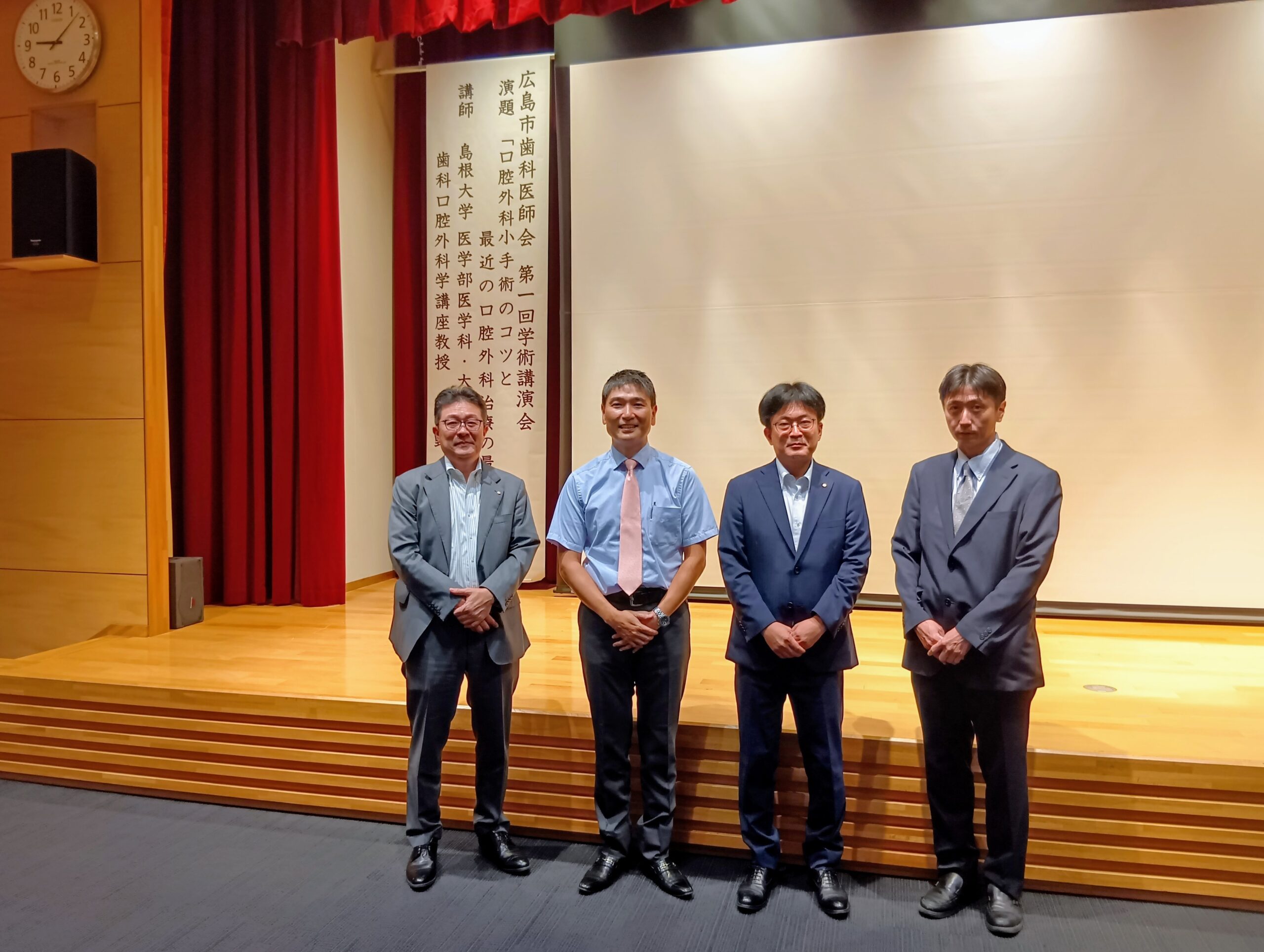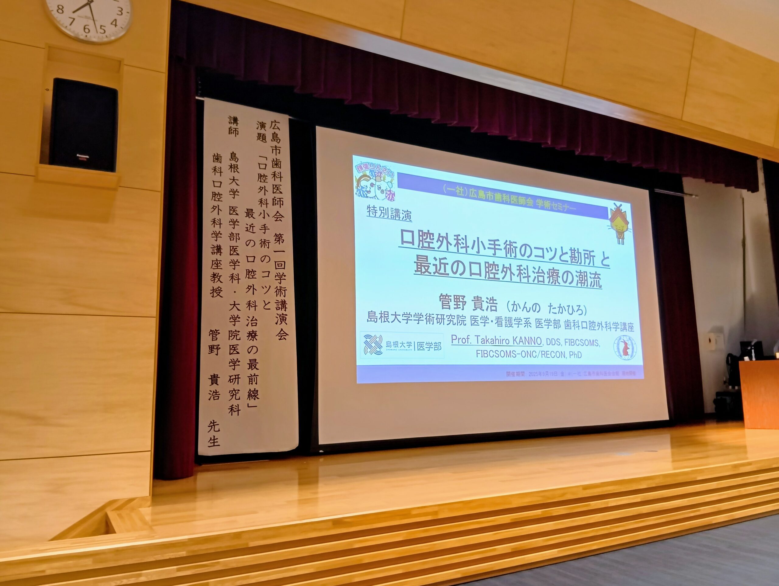 2025年9月19日(金)夕刻に、(一社)広島市歯科医師会の令和7年度学術講演会講師に召喚いただきました。“口腔外科小手術のコツと勘所 と 最近の口腔外科治療の潮流”のタイトルにて90分間の講演をさせていただきました。広島市内各所より多くの先生方の参加をいただき大変光栄でありました。学術担当理事を務められる花岡宏一先生は、母校福岡県立九州歯科大学の大切な同期の仲間であり、久しぶりの再会でありました。臨床学術交流を行え、わたくし自身大変に有意義な講演会でありました。